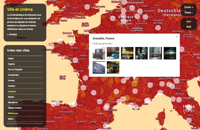 Développement d'une carte interactive à travers laquelle la Cinémathèque de Grenoble vous invite à découvrir une collection de photos de façades de cinémas existants ou disparus à travers différentes villes du monde.