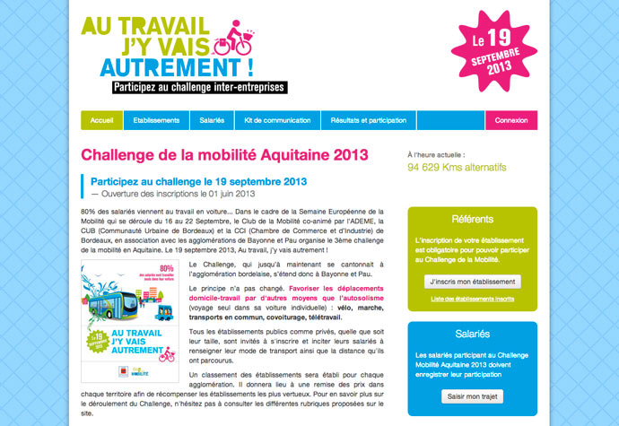 Réalisation de la plateforme web d'information, d'inscription et de collecte des résultats du Challenge Mobilité Aquitaine 2013 organisé par l'ADEME Aquitaine sur les agglomérations de Bordeaux, Bayonne et Pau.