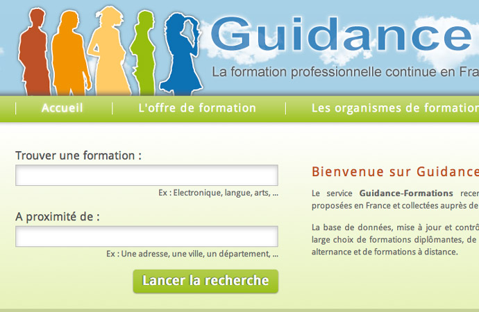 Guidance-formations est une plateforme web de collecte et de diffusion de l'offre de formation professionnelle continue géolocalisée à l'échelle nationale, à destination du grand public et des professionnels de la formation.